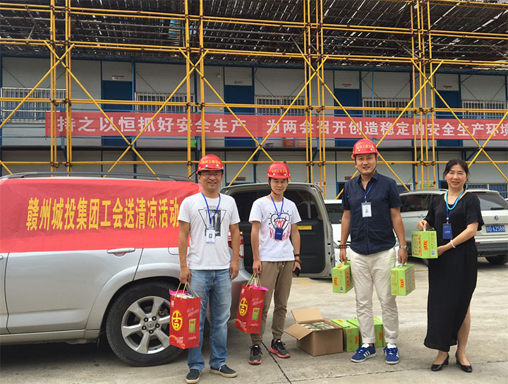 盛夏酷暑,驕陽(yáng)似火。7月16日至7月23日,贛州城投集團(tuán)工會(huì)認(rèn)真貫徹落實(shí)集團(tuán)黨委的指示精神,心系項(xiàng)目一線的廣大干部員工,積極開展“夏季送清涼”活動(dòng),認(rèn)真做好防暑降溫工作,用實(shí)際行動(dòng)踐行黨的十九大精神,聯(lián)系關(guān)愛干部員工,發(fā)揮橋梁紐帶作用。集團(tuán)工會(huì)主席、總經(jīng)理助理肖暉帶隊(duì)走訪慰問(wèn)。