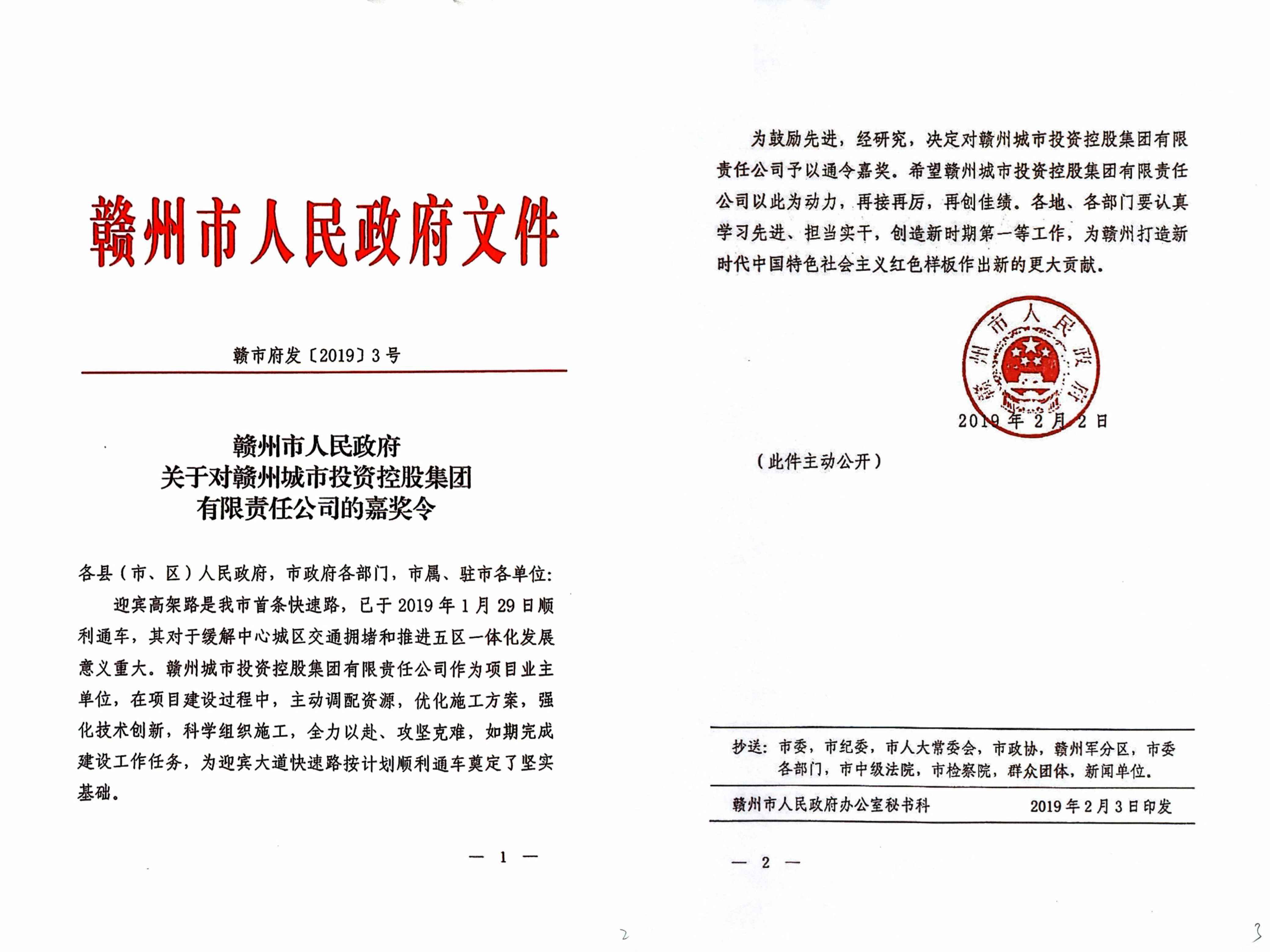 2019年贛州市人民政府嘉獎通報