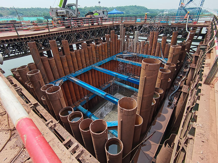 蟠龍大橋主橋涉水施工措施是技術(shù)難點(diǎn)、重要性節(jié)點(diǎn)、施工危險(xiǎn)性較大工程之一,主要技術(shù)難點(diǎn)在于水中墩柱承臺(tái)的圍堰施工,針對(duì)薄覆蓋層硬質(zhì)河床、承臺(tái)入巖等水文地質(zhì)、設(shè)計(jì)要求,工程管理公司黨總支在蟠龍大橋項(xiàng)目成立黨員先鋒隊(duì)攻堅(jiān)小組,精心組織、知難而上、勇于探索,在水中P17#、P18#墩采用了“成套鎖扣鋼管樁(φ630)+全套管全回轉(zhuǎn)鉆引孔開槽+清槽嵌固+封底”的圍堰方案,成功破解了項(xiàng)目建設(shè)中,水中薄覆蓋層硬質(zhì)河床引孔開槽、鋼管樁搭設(shè)鎖扣、反循環(huán)清槽、細(xì)石混凝土封槽、鎖扣止水等技術(shù)難點(diǎn)。