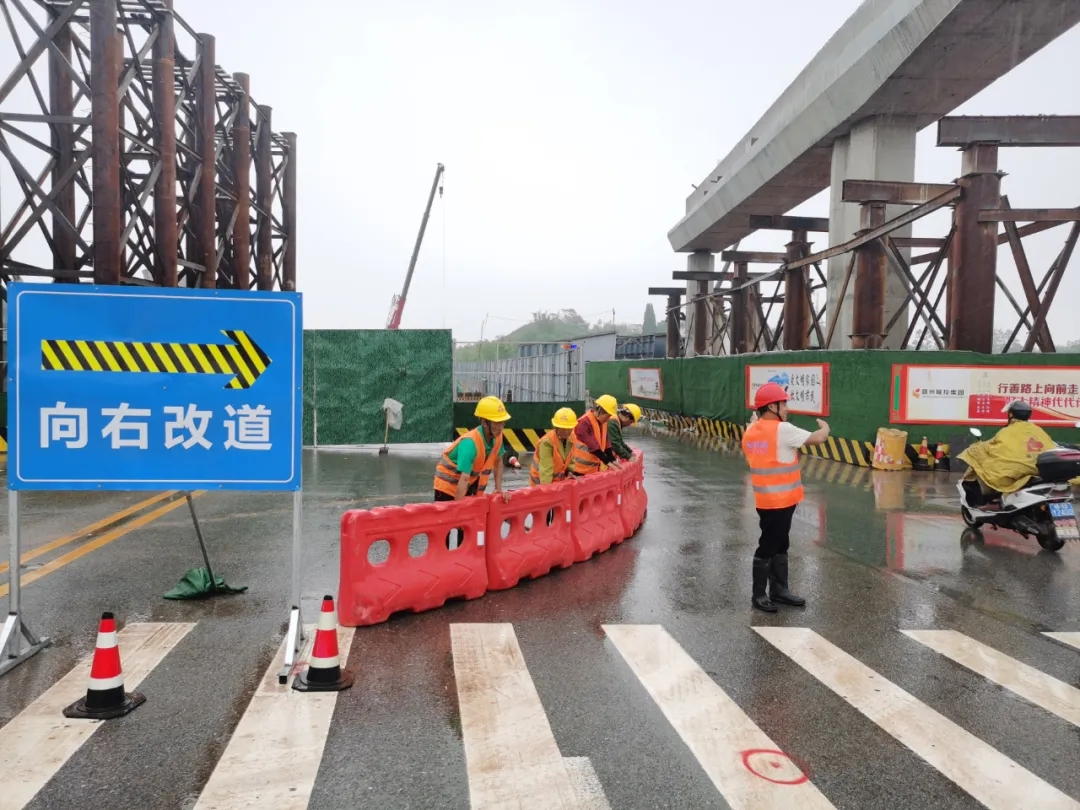 交通安全維護(hù)是項(xiàng)目施工的重中之重。為在確保施工安全和進(jìn)度的前提下,最大限度減少項(xiàng)目建設(shè)對(duì)交通的影響,贛州城投集團(tuán)項(xiàng)目部工作人員迅速行動(dòng),召集施工、監(jiān)理等單位討論編制創(chuàng)業(yè)路橋梁上跨崗邊大道的交通導(dǎo)行方案。為保證交通導(dǎo)行方案的可行性,項(xiàng)目部邀請(qǐng)交警部門(mén)、龍泉村村民到現(xiàn)場(chǎng)踏勘,聽(tīng)取意見(jiàn)、建議,并對(duì)方案進(jìn)一步優(yōu)化、完善。經(jīng)交警部門(mén)審批方案通過(guò)后,項(xiàng)目部集中力量抓住4月10日和11日周末兩天的空檔期,加班加點(diǎn)完成了跨崗邊大道區(qū)域的交通導(dǎo)行及圍擋,并在后續(xù)施工中安排了專人對(duì)車(chē)輛、行人進(jìn)行引導(dǎo),對(duì)隱患及時(shí)排查整改,派駐安全引導(dǎo)員在學(xué)生上下課時(shí)間點(diǎn)到路口對(duì)通行車(chē)輛、行人進(jìn)行引導(dǎo),護(hù)航創(chuàng)業(yè)路三標(biāo)上跨崗邊大道橋梁施工階段的原有地面道路社會(huì)車(chē)輛及行人有序通行。