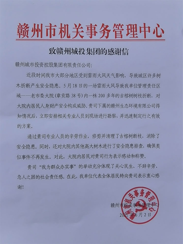 近日,贛州市機(jī)關(guān)事務(wù)管理中心發(fā)來(lái)一封感謝信,點(diǎn)贊贛州城投集團(tuán)深入開(kāi)展“我為群眾辦實(shí)事”實(shí)踐活動(dòng)的感人舉動(dòng)。