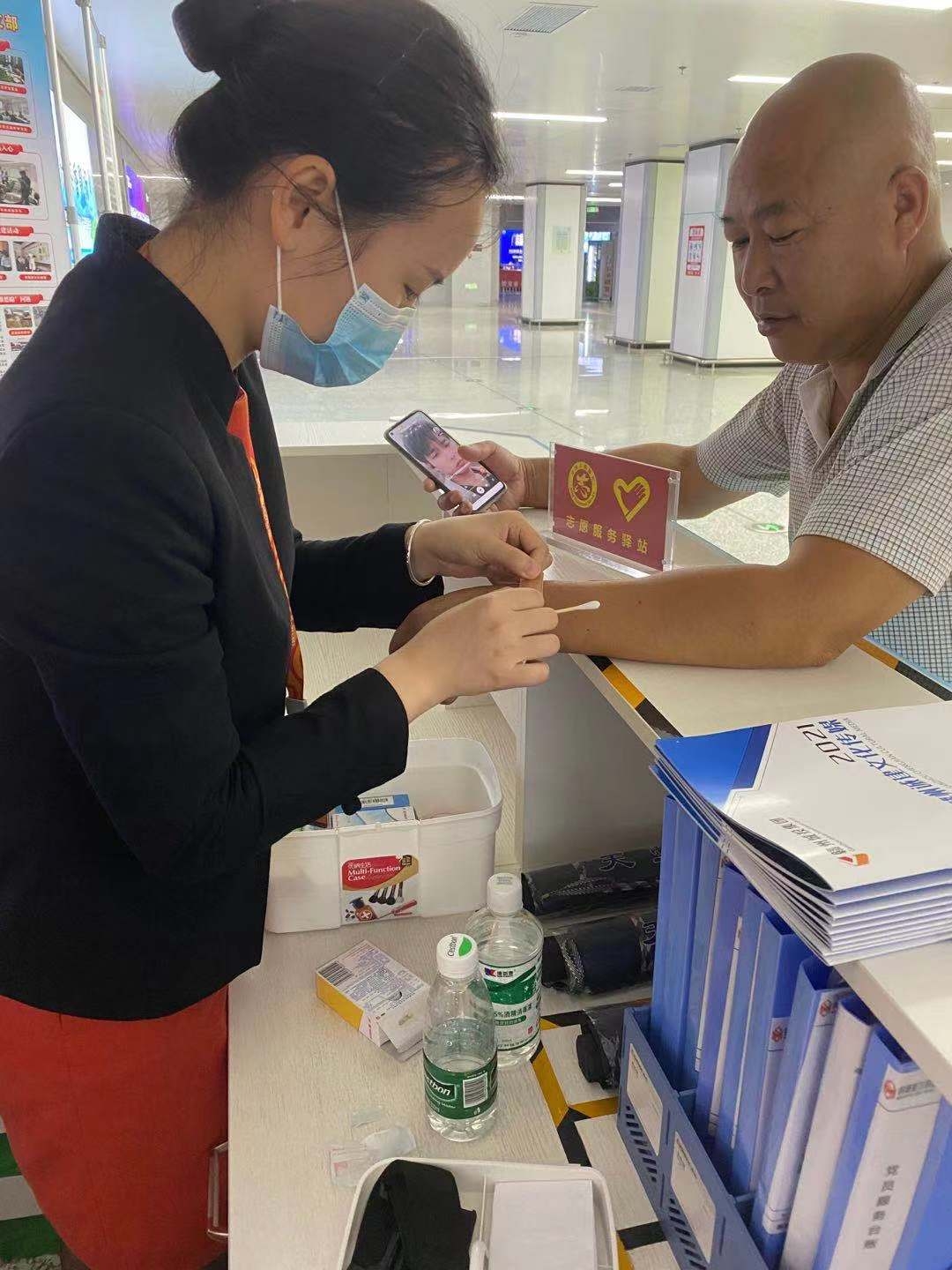 6月6日,一位男士來(lái)到贛州西站黨員服務(wù)窗口詢問(wèn)是否有創(chuàng)可貼,經(jīng)了解,該旅客手部因不慎刮傷流血不止,值班人員察看傷口后,迅速先幫旅客采取酒精消毒,再熟練地用創(chuàng)可貼包扎好傷口。該男士連聲道謝,露出了滿意的笑容。