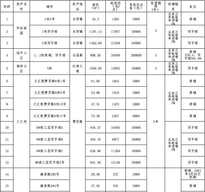 贛州振興實業(yè)有限責(zé)任公司委托江西江南拍賣有限公司,定于2021年5月28日10:00開始在贛州市公共資源交易中心(長征大道9號)進(jìn)行國有資產(chǎn)公開招租,現(xiàn)歡迎符合條件的單位或個人前來報名參加競租。