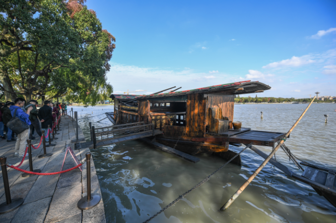 到新中國成立時,一大代表們當年乘坐的畫舫已難覓蹤跡。1959年,南湖革命紀念館開始籌建,在多方考證和細致還原后,送往北京的船模得到了認可。經過緊張施工,“中共一大紀念船”在藍天秀水間重現(xiàn)。1964年,一大代表董必武重來南湖,登船時感慨萬千,賦詩曰:“革命聲傳畫舫中,誕生共黨慶工農。重來正值清明節(jié),煙雨迷濛訪舊蹤。”