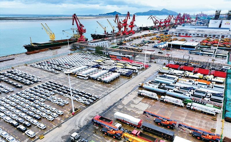 江蘇全面把握在全國開放格局中的發(fā)展定位,發(fā)揮“一帶一路”交匯點優(yōu)勢,聚焦建設具有世界聚合力的雙向開放樞紐的目標,加快推進高水平對外開放,外貿進出口總額連續(xù)多年居全國前列。圖為2024年10月18日,在江蘇省連云港東方港務分公司碼頭,大批國產車輛集港準備裝船(無人機照片)。新華社發(fā) 王春/攝