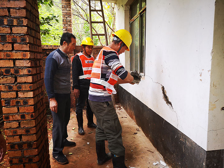 收到群眾訴求后,贛州建工集團黨支部明確責任分工,由贛州建工集團駐蓉江花園(四區(qū))項目部的工作人員前往實地了解情況。該村村民邱家飛年近七旬,所居住的房屋因年久失修,導致門廳墻面破損,房屋內(nèi)外均存在一定程度的裂縫。此外,村里另有一對姐弟居住的房屋由于結構問題也存在幾處裂縫。